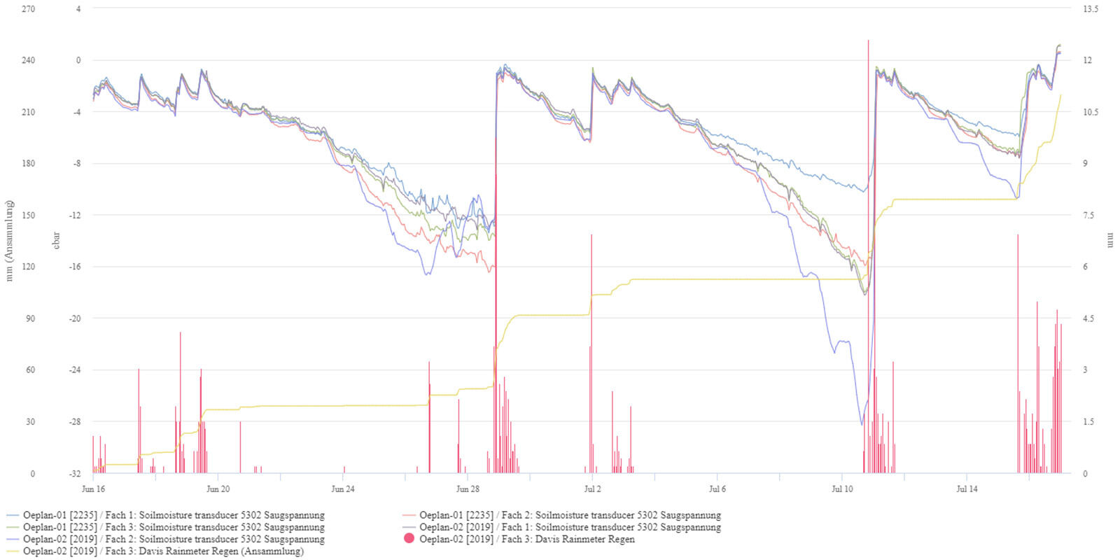 Die Wasserkorporation Alt St.Johann-Unterwasser errichtete 2019 eine neue Verbindungsleitung zwischen den beiden Gemeinden. Gleichzeitig wurde das Wasserversorgungsnetz in mehreren Weilern ausgebaut und ein neues Reservoir errichtet. Die Weiler befinden sich in steiler Lage nördlich des Ortszentrums und reichen bis in eine Höhe von 1'200 m ü.M. Die Arbeiten wurden in mehreren Etappen ausgeführt und wurden 2022 erfolgreich abgeschlossen. Wir durften die Arbeiten in allen Phasen vom Bodenschutzkonzept bis zur Bauausführung begleiten. Besonders herausfordernd war das steile Gelände. Für die Arbeiten wurden erstmals eine automatische Tensiometerstation eingesetzt, die die Bodenfeuchtigkeit kontinuierlich aufzeichnet und allen Beteiligten online zur Verfügung stellt.